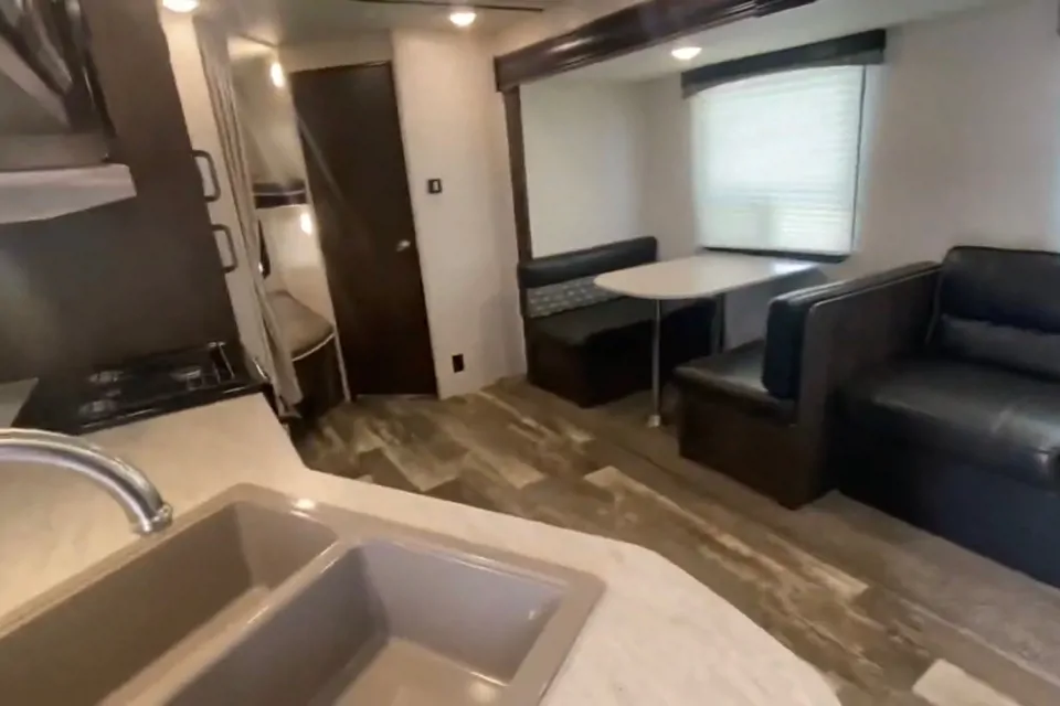 This 2021 model is 30 feet (26 feet box length) and super roomy. Beautiful and modern. Camping is just a little more luxurious with all the amenities of home. Features a microwave, fridge, freezer, oven/stove, stand up shower, AC, two double bunks, queen bed, pull out couch (VERY comfy!) and dinette conversion. A cool LED powered awning creates perfect shade, and outdoor speakers create the perfect vibe. TONS of storage. USB ports and plugs everywhere. No carpet! Sleeps up to 10.