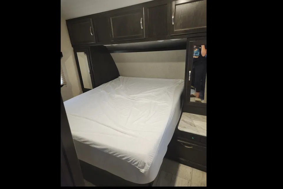 Enjoy all the perks of a huge RV in this perfect size to tow and fit on the best sites. You get your own master bedroom with a TV that can spin into the room so you can watch a movie while the kids sleep on the bunks without interruptions on a rainy or cool night. Each bunk has their own light for night time reading/playing and charging ports.