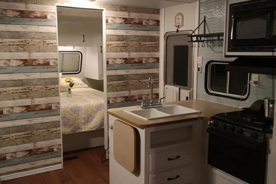 This trailer is equipped with 2 bunkbeds(1 is oversized), pull out sofa bed and 1 queen size bed
