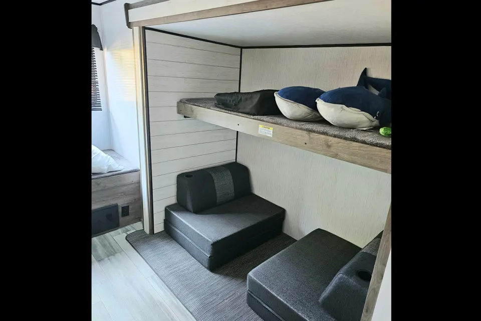 Welcome to your home away from home! Our cozy, modern RV is the perfect getaway for families or groups, comfortably sleeping up to 10 people. With a spacious double slide-out design, there’s plenty of room to relax—whether it's the kids enjoying their own play-and-sleep area in the back, or adults unwinding in the private master suite up front. You'll love the full bathroom with a shower and toilet, plus the convenient separate entrance from outside—perfect for those late-night campfires without disturbing anyone inside. Whether you're hitting the road or settling into a peaceful campsite, this RV is ready to help you make lasting memories.