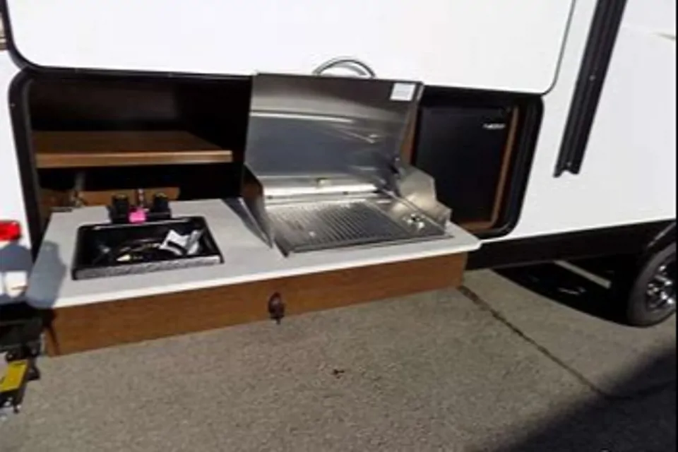Our trailer sports a nice outside kitchen with a fridge, grill and sink, also has an outlet, keeping drinks outside and allowing for extra cooking space if needed.