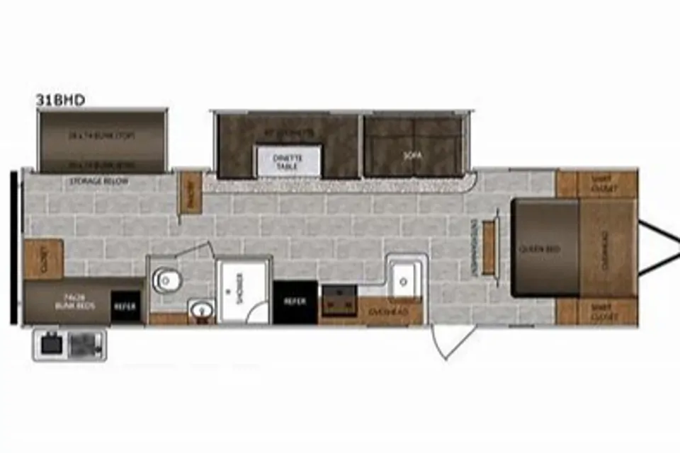 It features 2 slide outs, one in the bunk room making for lots of space for the kids to have on their own and to keep all their stuff out of the way!, and a slide in the main area with a reclining loveseat and the dinette, this opens up the main area so it doesn't feel cramped.