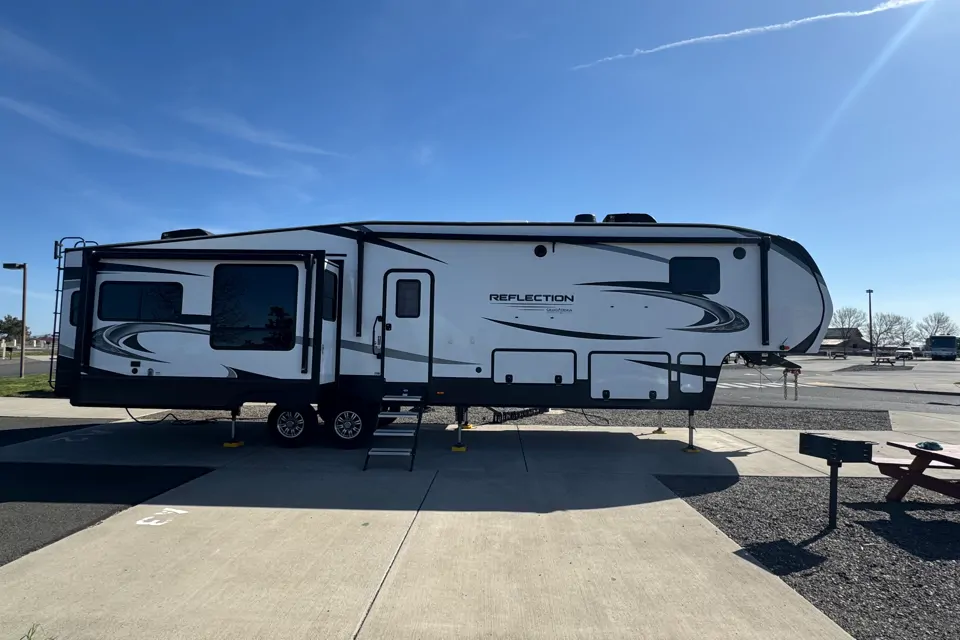 Electric jacks and automatic stabilization and leveling make set up of this glorious rig a breeze. Be the envy of the entire campground. Room for the whole family with all of the comforts of home. With the mid-room/office and overhead loft, this layout really allows for room to stretch without feeling cramped.Tankless water heater bringing endless on demand hot showers. Tons of storage. Private master suite. Cozy up in the massage/heated recliners or loveseat while watching TV or the ambiance of the fireplace with or without having supplemental heat on. With dual A/C units and Full forced air heating throughout you're well covered. Full kitchen with island for additional counter space. Outdoor shower hookup on both sides of the fifth wheel, outdoor storage and mini fridge for additional beverages/food. Dual power awnings provide ample canvas coverage from the front all the way to the back. Thank you for allowing us to share our little slice of heaven with you.
