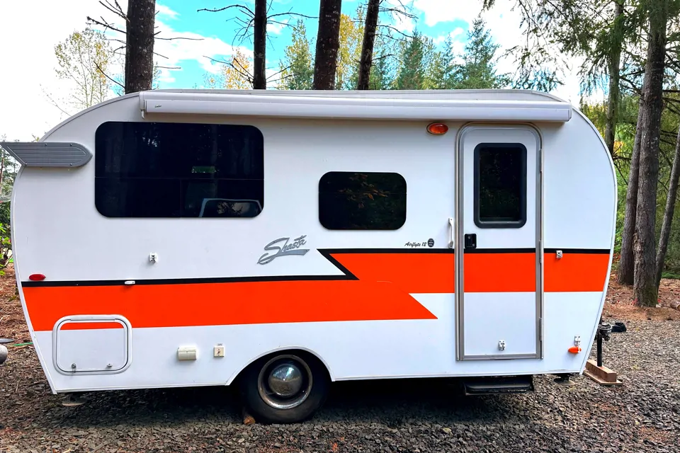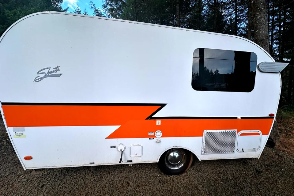 Retro design with contemporary twist. This 2009 Shasta Airflyte will take you back in time, but give you modern comforts. Sleeps 2 with a fold down table that converts to a Queen bed. All electric with a microwave, refrigerator, sink, shower, and toilet. Heat and AC. Hot plate included.The battery runs the lights, bathroom fan, and water pump. You will need an electrical out let to run the furnace, fridge, microwave, and wall outlets . Fire extinguisher and smoke detector. 6-gallon water heater.