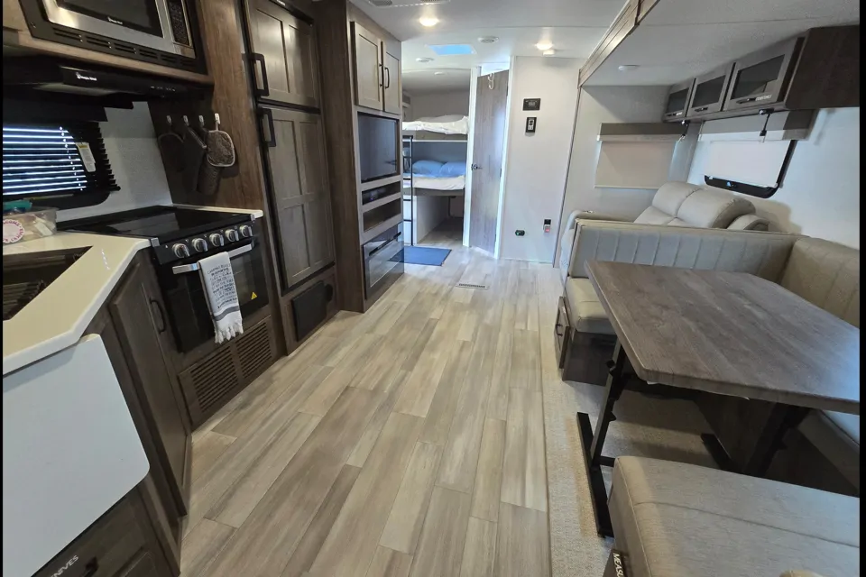 Double size bunks, dual entry, king U-dinette, theater seating, walk-in pantry, electronically controlled heated holding tanks, and enclosed underbelly