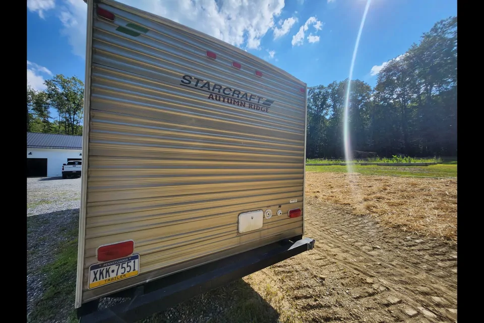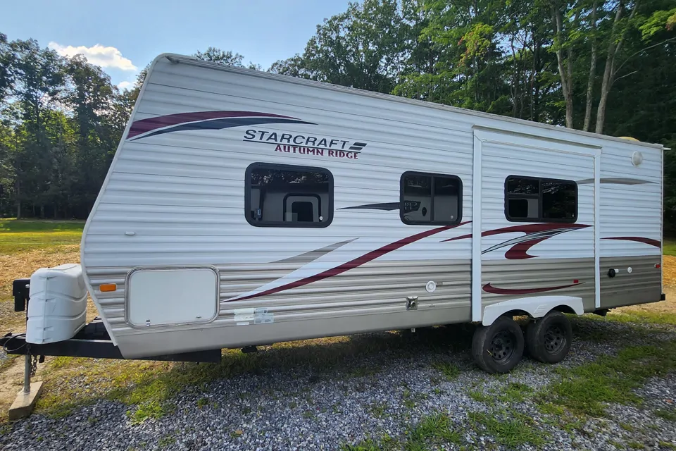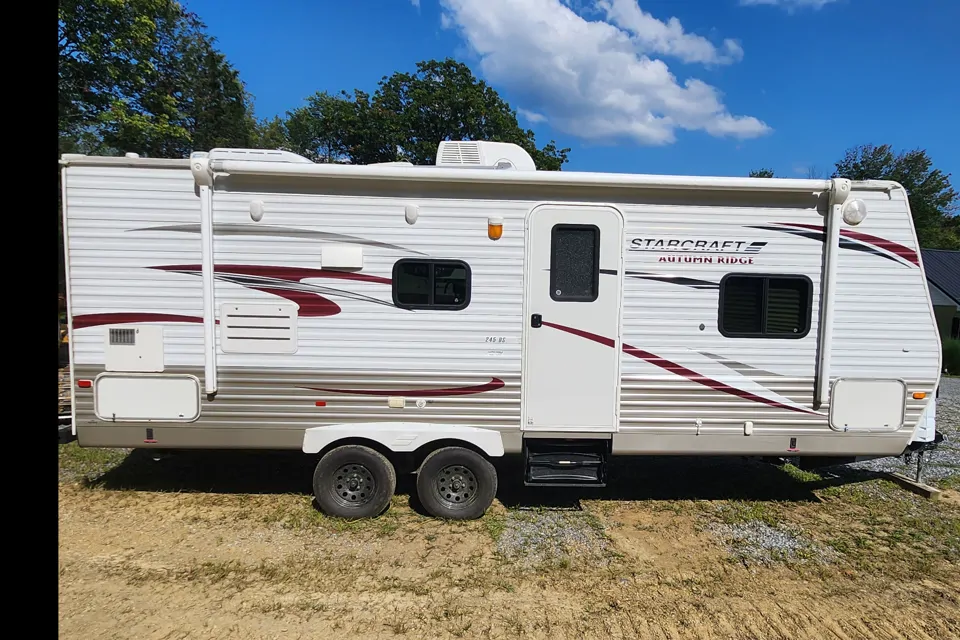 2013 Starcraft Autumn Ridge 245DS travel trailer for sale, boasting a full bathroom, kitchen with stove and oven, queen-sized bed, foldout couch, and dinette that converts into a bed. Additional features include an outdoor shower, heat, and air conditioning. This cozy camper is ideally suited for smaller vehicles and offers a comfortable living space. I provide coffee pot, 32" roku tv.