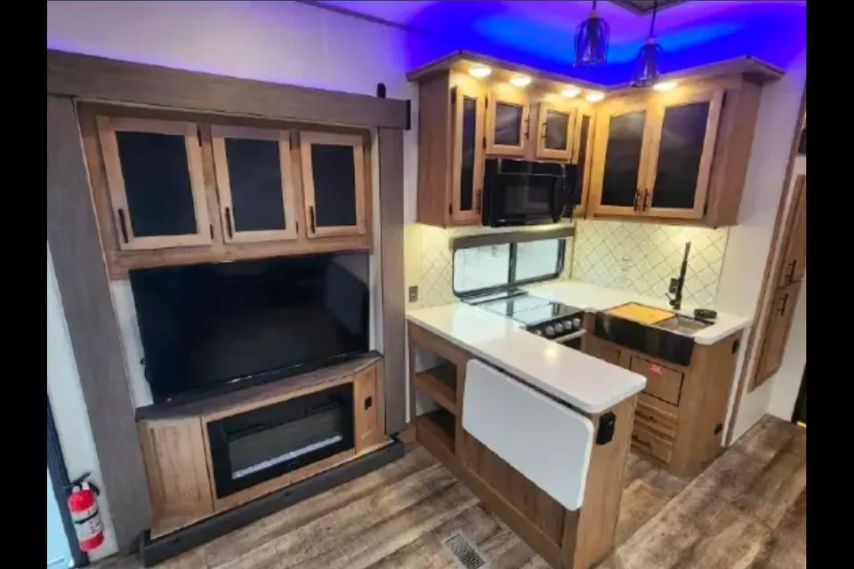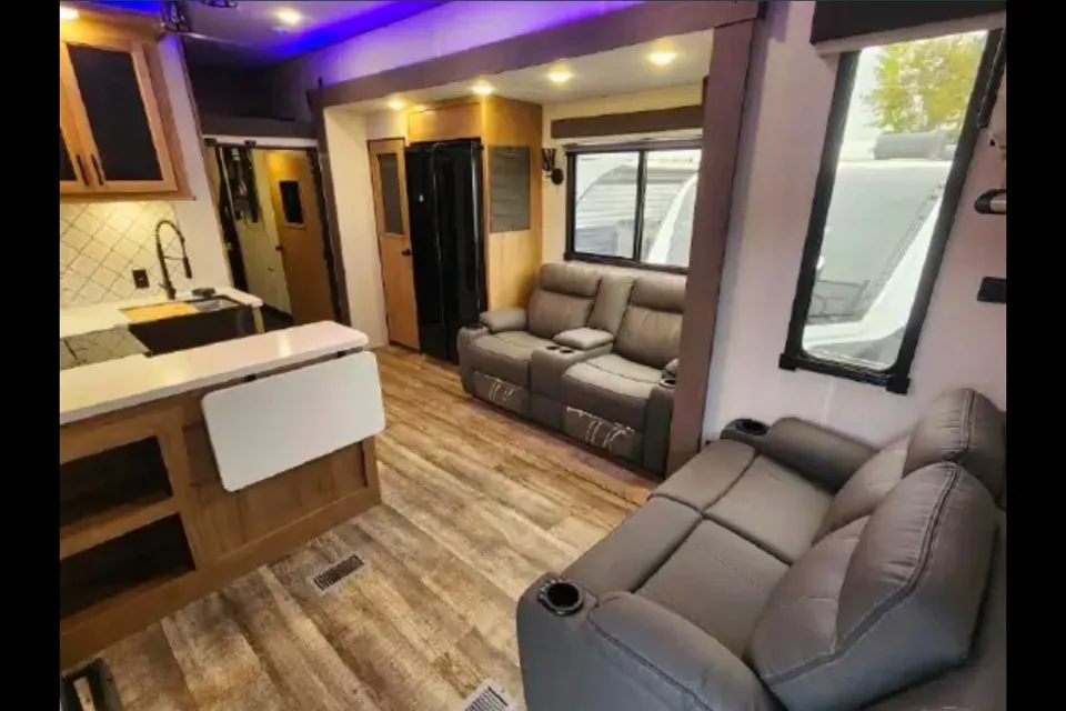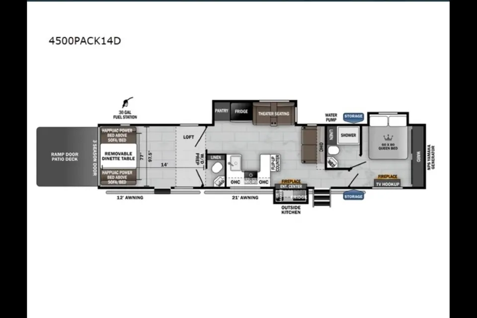The Forest River Wolf Pack 4500PACK14D is a luxury fifth wheel toy hauler, part of the Diamond Series, designed for long-distance hauling and comfortable living. It features an estimated 14-foot garage, a 45-foot 3-inch total length, and a "bath-and-a-half" layout, making it suitable for families or groups who need to transport ATVs or side-by-sides. 30 gallon on board gas tank.