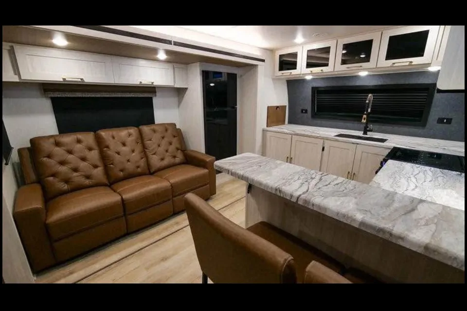 This RV is equipped with electric awning, outdoor speakers, LED lighting, and everything needed for full-service campsites.