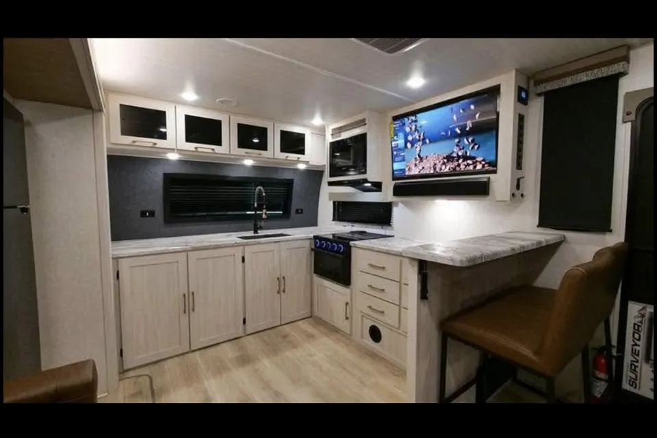 One of the standout features of this trailer is the spacious front kitchen with tons of counter space. It includes a large refrigerator, microwave, oven, and a deep sink — perfect for cooking real meals while camping.