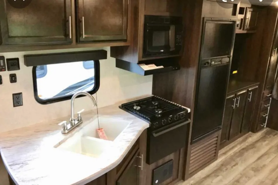 It has one large pull out for the dinning room and living room, a 50" TV inside, outdoor shower, outdoor fridge and stove, master bedroom with queen size bed. All pots, pans, utensils, linens, etc are included in the trailer. Additional inclusions to be provided, at no extra charge, upon request (camping chairs, fishing rods, etc.