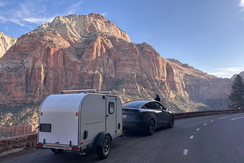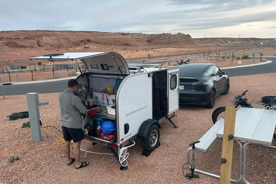 Mini Roulotte utra légère, lit double + possibilité pour un jeune enfant, cuisine extérieure avec branchement pour eau et électricité, panneau solaire, batterie et ondulateur. Seulement 500 lbs, peut-être tiré avec une petite voiture ou une voiture électrique (Voir la capacité de remorquage de votre marque/modèle). Possibilité de livraison à votre lieu de camping.