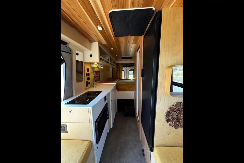 Plaque à induction (1800 W) 2 ronds, four multifonctions, four micro-ondes, air fryer un évier, une batterie de cuisine complète et tout plein d'accessoires pour cuisiner de vrais festins. Pour vos provisions: Grand frigo 12 V avec un congélateur .