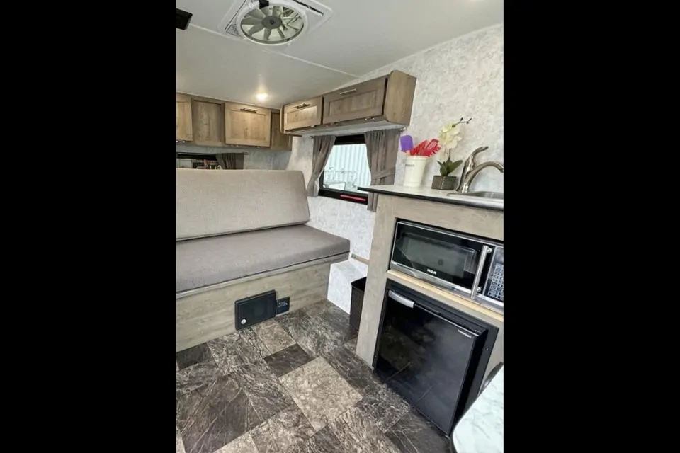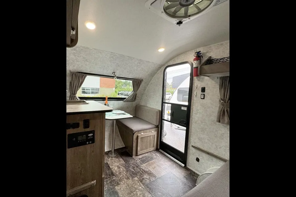 - Included equipment: 1.8 cu. ft. refrigerator, microwave, sink, induction cooktop, portable electric heater, fan ceiling light, USB ports, LED lighting, stabilizer jacks, electric brake