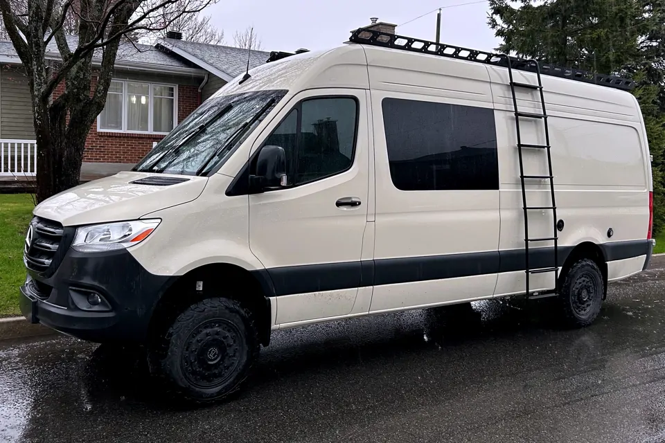 Partez à l’aventure avec The Golden, un Mercedes-Benz Sprinter 2024 170” 4x4 prêt à vous suivre partout, avec seulement 20 000 km au compteur. Confortable et entièrement autonome, il accueille jusqu’à 5 personnes avec ceintures. Parfait pour l’exploration urbaine comme les grands espaces, il est équipé de pneus tout-terrain, d’un rack de toit en aluminium, d’une échelle extérieure et d’un auvent Fiamma.