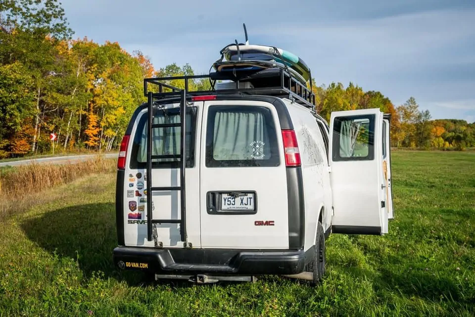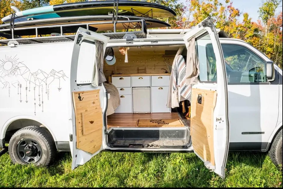 Je vous présente ma belle Savana. Aménager avec amour pour sillonner les routes de ce monde dans le confort. Pour moi bien dormir est essentiel donc j’ai ajouté un couvre matelas sur le matelas en duvet de 2,5 po. On y dort vraiment bien dans le lit qui est de grandeur Queen. Elle possède tout le nécessaire pour cuisiner. Petit poêle au propane deux ronds, des poêlons, la vaisselle et ustensiles. Quelques épices sont aussi disponible. Nous avons un ventilateur de toit qui pousse ou tire l’air (3 vitesses) et il rend l’habitacle très confortable. Il est situé au dessus du lit. Le banc passager pivote pour relaxer dans la van. J'ai une petite tablette bien utile soit comme bar ou autre. Sous le lit se trouve une table avec banquette. Il y a même une pôle pour le rideau de douche à l’arrière ainsi qu’un système de douche. Une belle échelle pour l’accès au toit. Un rack sur le toit pour loger plus de bagages. Des panneaux solaires. Nous mettons nos paddles sur le toit. Bloc de nivellement inclus. Quelques jeux sont aussi disponibles dans la van. Ils a aussi des rideaux dans chaque fenêtres.