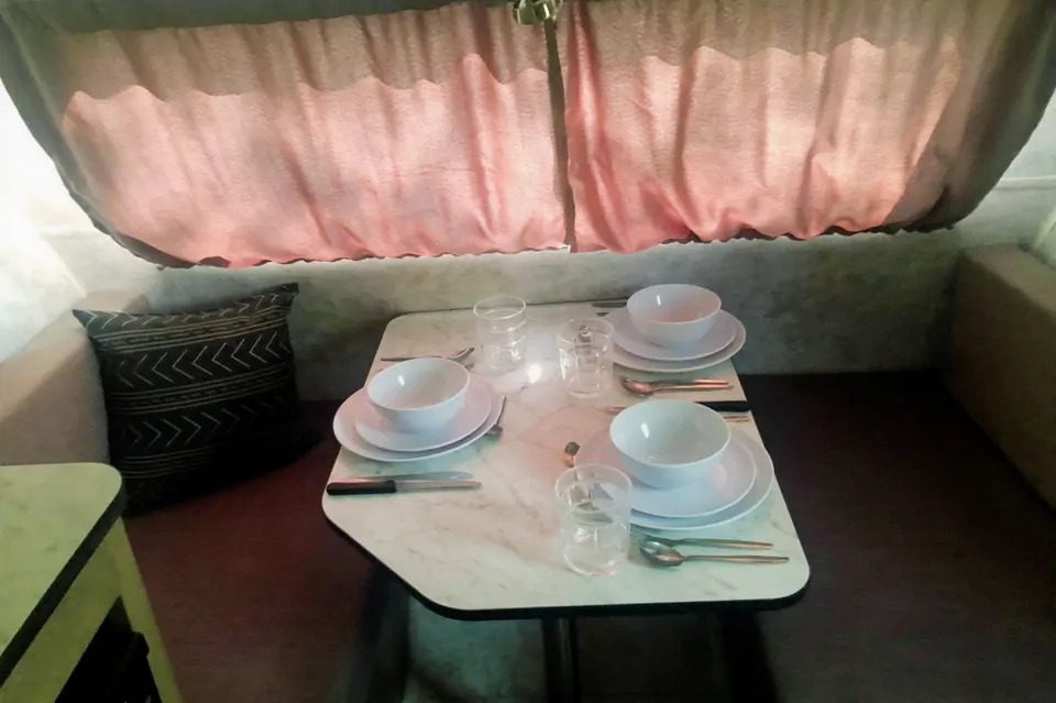 La Sher 12 V vous offre un sofa convertible en lit de 70” x 70” pouvant accueillir deux personnes et une table indépendante convertible en lit de 70” x 32” pouvant accueillir une personne. Elle possède l’air climatisée, un chauffage électrique, un ventilateur , un four à micro-onde, un réfrigérateur de 1.7 pieds cube, une plaque d’induction électrique et un auvent. Il y a 15 gallons de réservoir d'eau ainsi qu'un réservoir d'eau grise de 15 gallons.