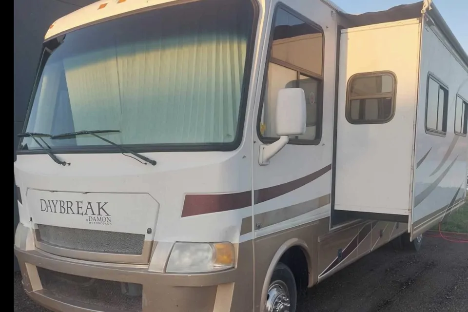 2008 Damon Daybreak 3578, Ford V10 engine, two slides, two air conditioners, central furnace and vac. Onan 5500 generator. The driver and passenger seats rotate to face the living area. There is a hide a bed couch with storage drawer. The dining booth converts to a bed with under seat storage. The Jackknife couch also converts to a small bed. Overall sleeping capacity for 7. The galley features a two way refrigerator, propane stove with oven and over counter microwave, pantry and multiple storage cabinets.