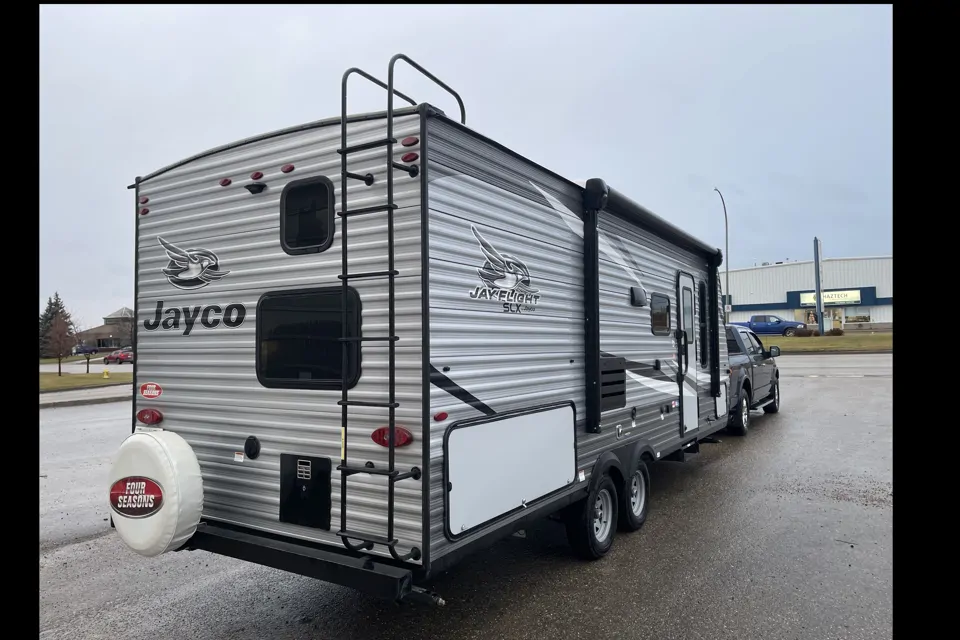 Does have AC and furnace, water heater propane and electric, water pump, all hoses and cables provided. TV, stereo system with auxiliary speakers outside. Awning with led lights. 30 AMP with adapters for 50 AMP and regular plug