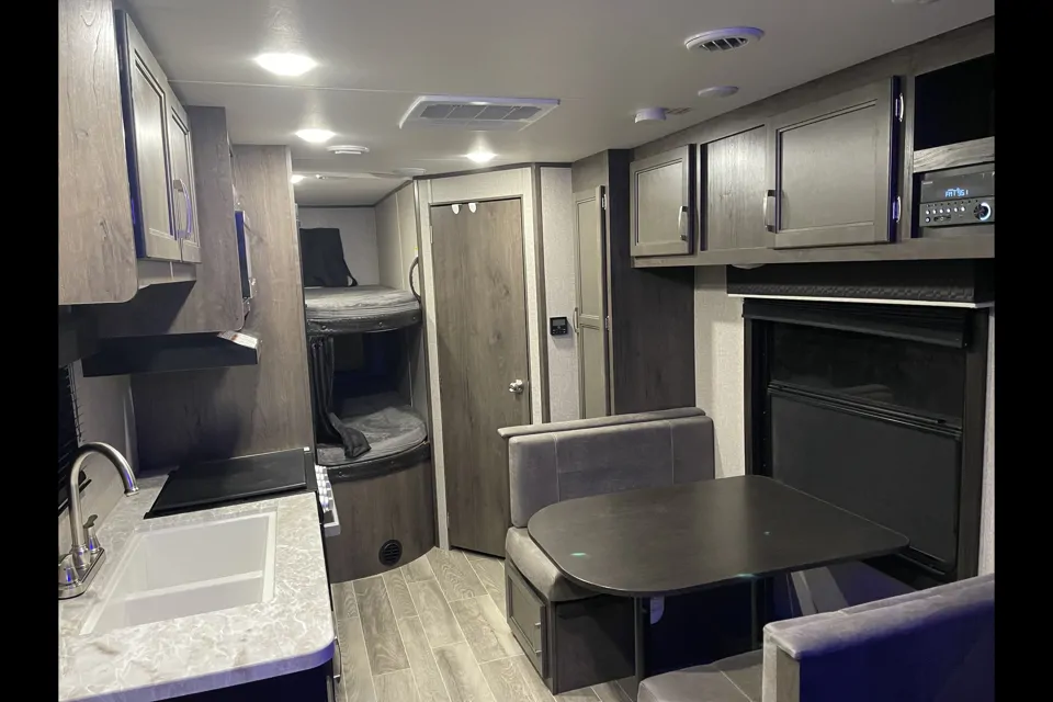 Perfect RV for family vocation, with king bed at the front divided with curtains from living spaces. Bunk double bed fit 4 kids easy. Dining table also converts into double bed.