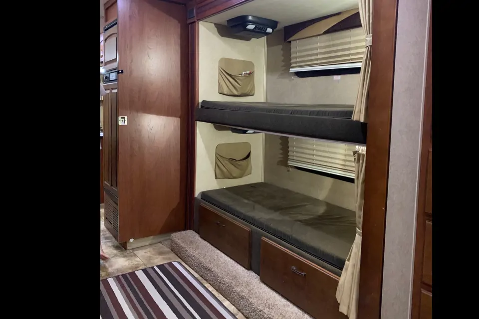 The sturdy extra tall bed over cab comfortably fits 2. Dinette and sofa also provide sleeping space for the little ones.