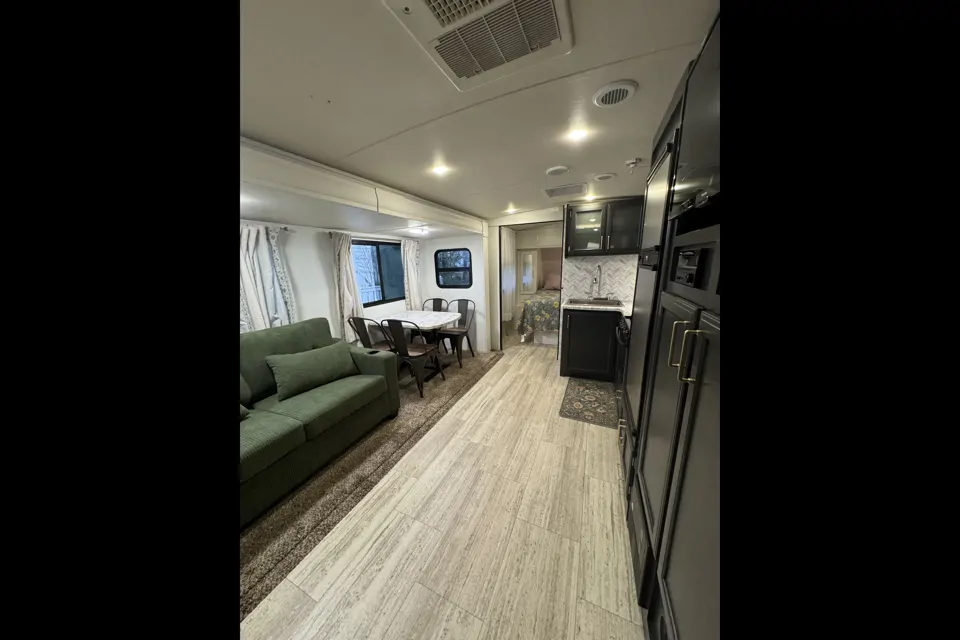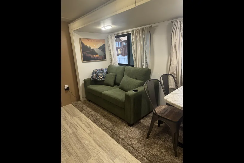 Features a double size bunk that can fit two children or one adult in each bunk comfortably and a double size pull out couch. The private master bedroom has a true queen sized bed with an updated thick and comfortable mattress. The master bedroom also includes a TV. Plenty of room for the entire family! One slide out that expands the living room/kitchen area includes a couch and dining table seated for four. Here you can enjoy family playing games or relaxing watching TV.