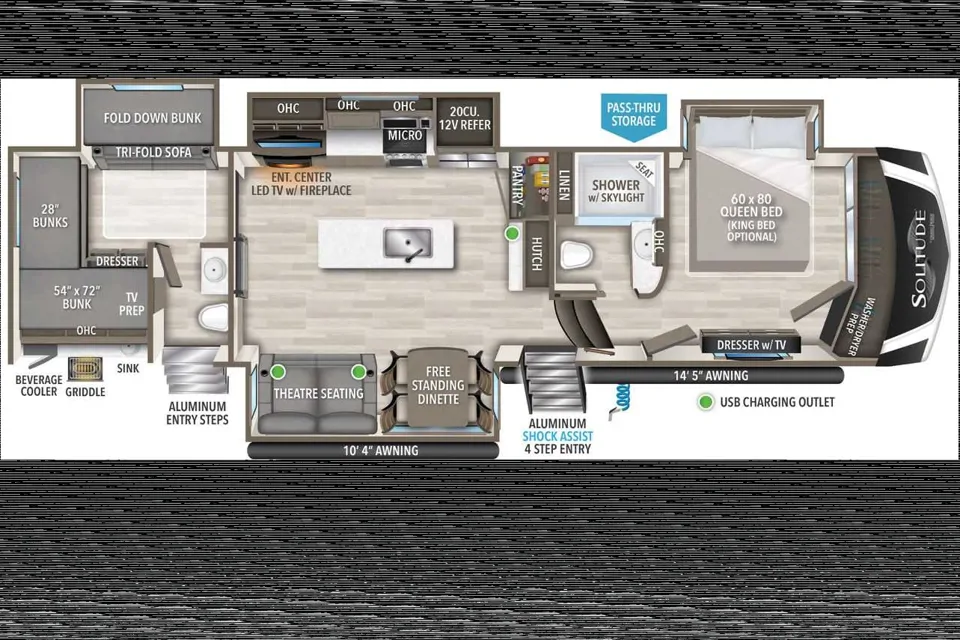 2020 Grand Design Solitude 3740 BHS. This is a great family camper! Sleep up to eight. Upgraded queen mattress in the master bedroom, and improved mattresses in the two single bunks. The top bunk sleeps two and the pull-out sofa sleeps two. Dual AC. 1 full bath and one-half bath.