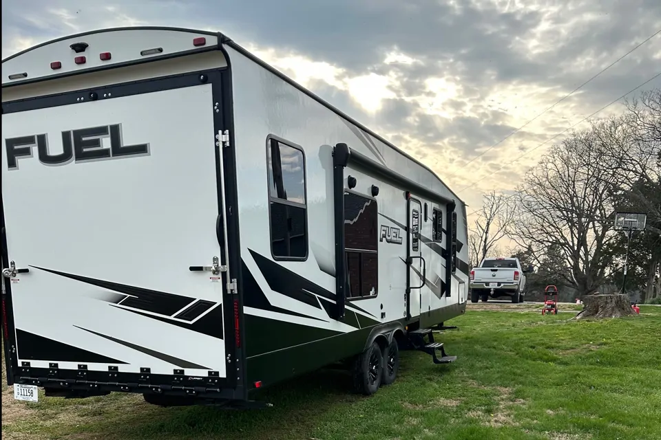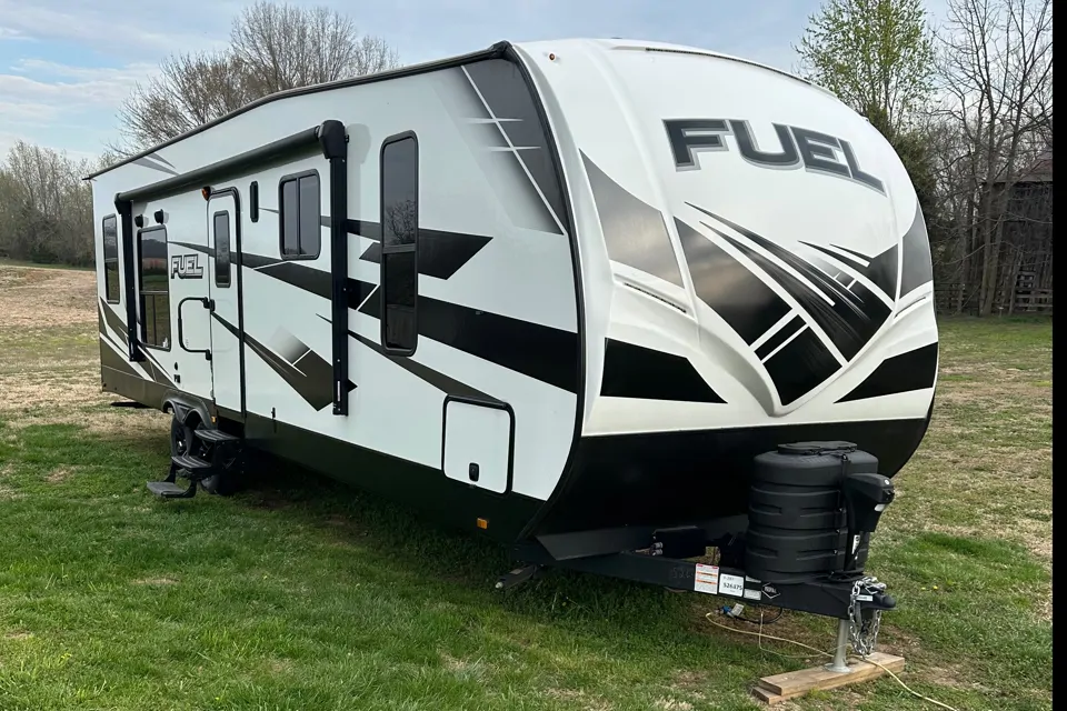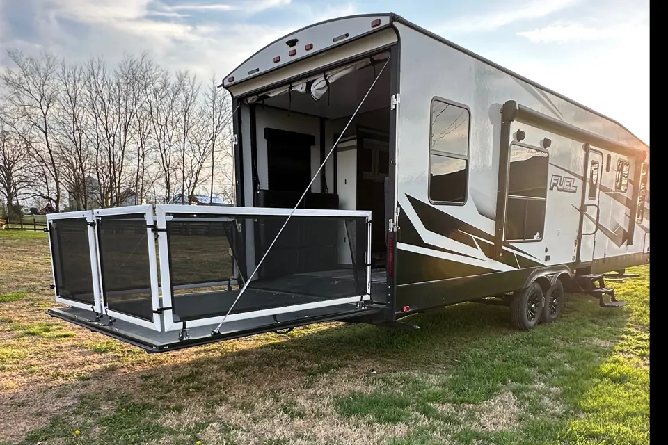 Heartland Fuel F-287, a rugged yet stylish travel trailer toy hauler built for both comfort and functionality. Whether you're hauling side-by-sides, motorcycles, or AlVs, the spacious 16' 3"foot garage and 5,000 Ib-rated ramp door make loading and unloading a breeze.
