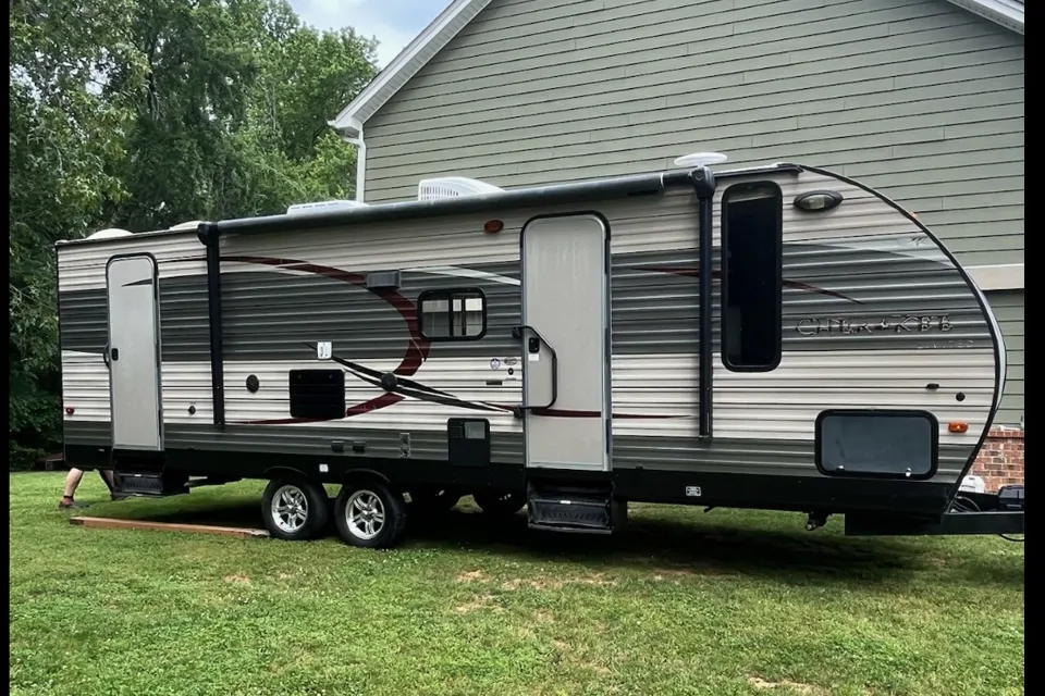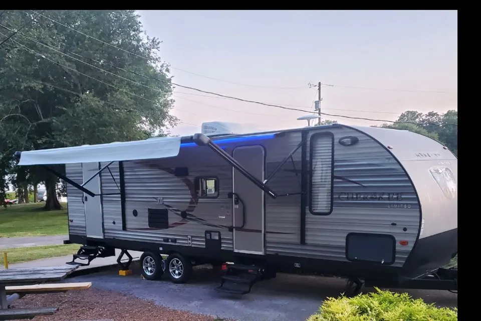Sleeps up to 10 . Queen bed is very comfortable. Has 2 doors, 1 in the bathroom that's convenient and keeps the cool air inside during the summer. Large awning. Awning had a shade for extra coverage from the summer sun!