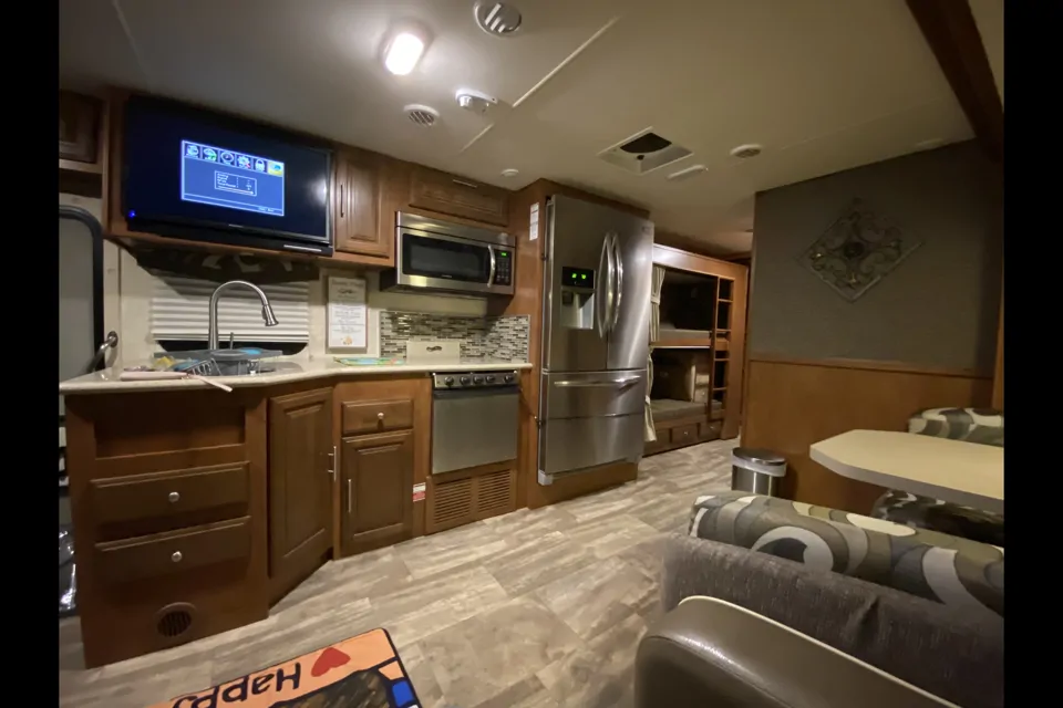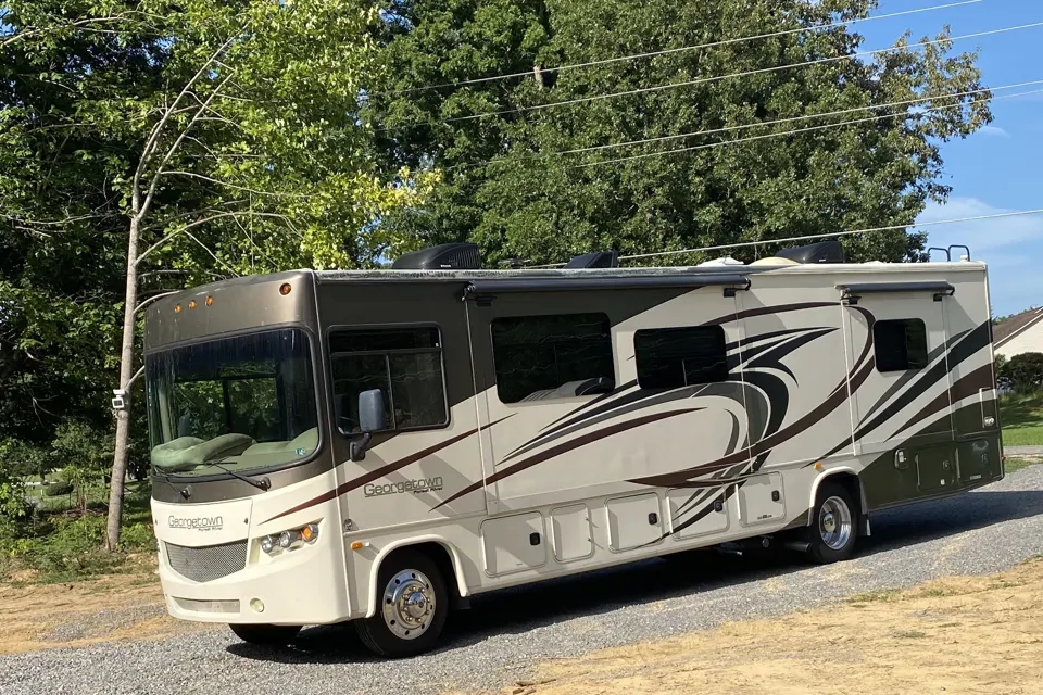 Beautiful and well maintained Class-A coach where you can generator boon-dock without power/water hook ups for days if you wish or can camp 50amp (or converter avail for 30amp if needed) with 2 FULL bathrooms which means 2 black water/2 gray water storage tanks, 80 gallon fresh water tank (routinely sanitized), main water filter, full size fridge/freezer w/ ice maker. Easily sleeps 6 with 2 bunks and 1 drop-down bunk above the cab and a luxurious mattress on the king bed master. 3 slides w/ auto-level makes set up a breeze in literally 5 min from stopping to hook-ups! Easy to drive with the side and reverse camera’s. TV’s galore inside and outside, WI-FI capable, surround sound w/ DVD, comfy recliners w/ USB access throughout. This RV is a unicorn with all her features, you will be “glamping” in style and ease!