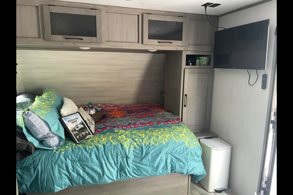 This camper has 4 separate beds (queen, 2 bunks, and convertible dinette), and sleeps 5 comfortably (please note the bunks are not suitable for large adults). The 32 inch TV mounts both inside and outside, making it perfect for game days or movie nights under the stars.