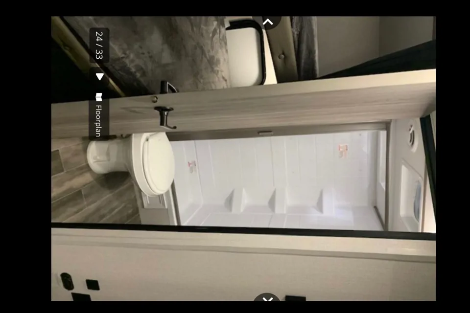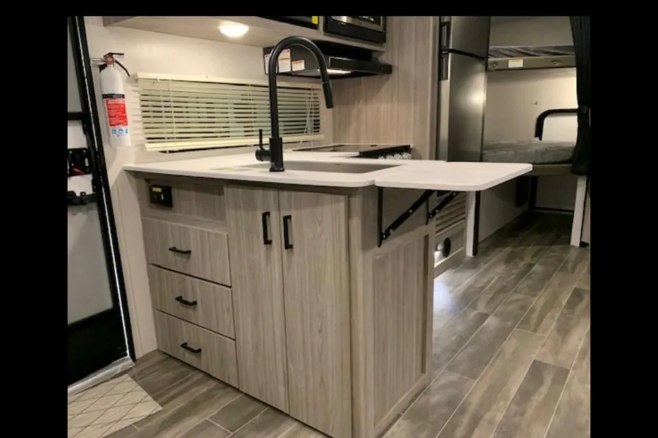 This camper is perfect for making memories everywhere you go! The camper has a Murphy bed to give you extra space when sleeping is not in use. Bunkbeds are very spacious that can sleep two people easily. The dinette also turns into a full-size bed. Lots of storage and space inside and outside of the camper. Does have a walk-in shower with sunroof. Indoor and outdoor speakers are great to enjoy outside under the awning. There is a small door on the back of the camper that opens and the bottom bunk does lift up, perfect for kayaks, or bikes to be traveled!