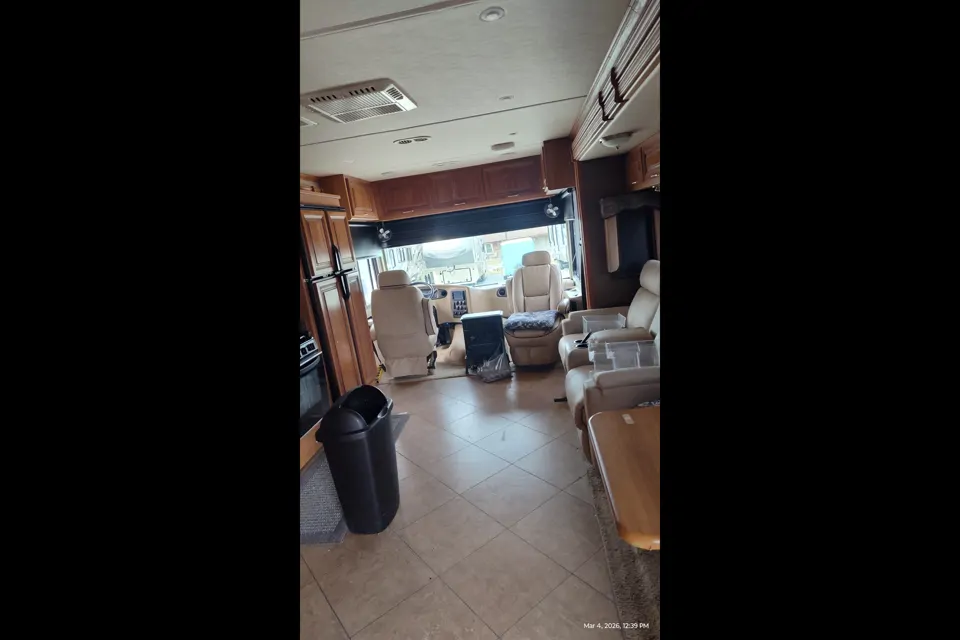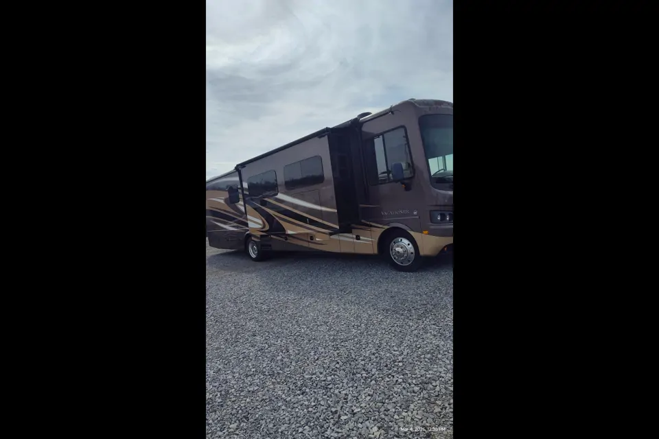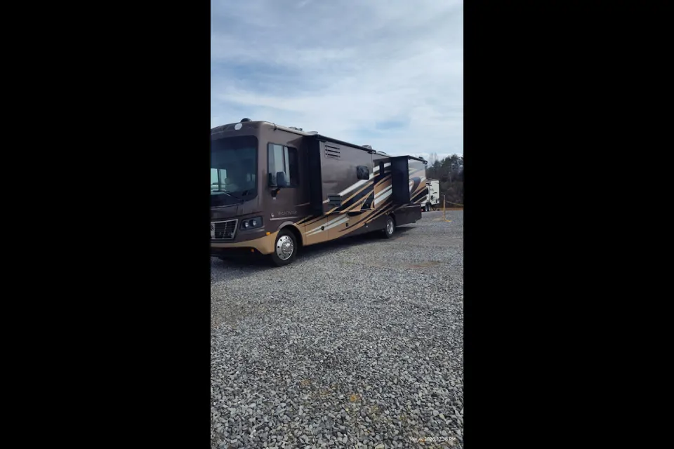 3 slides king size bed washer dryer theater recliners two bathrooms lots of storage drives great full hookups 3 TVs 1 in bedroom 1 in living room 1 outside big shower for an RV large awning pots pans dishes