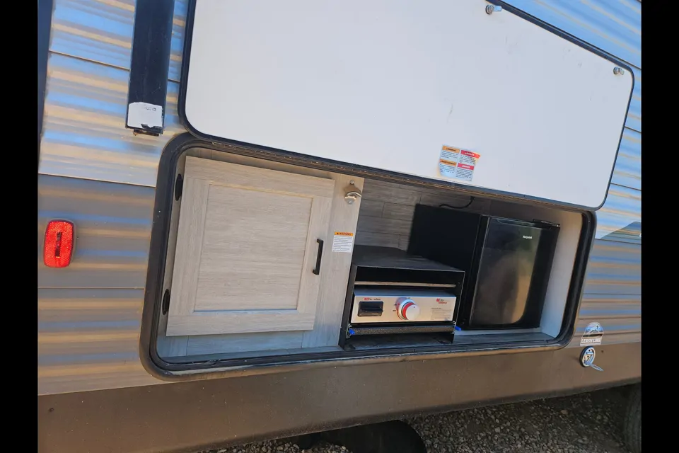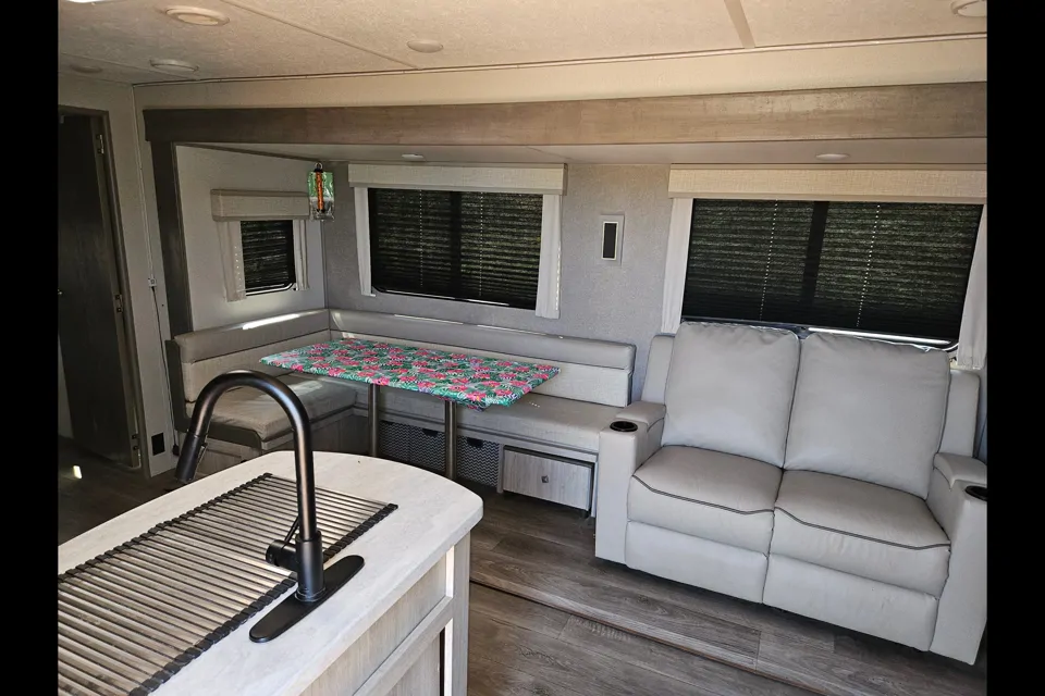 Sleeps up to 8 – Queen master bedroom, private bunkhouse with queen bunks & convertible dinette & jackknife sofa. One slode out on the driver side. Full Kitchen – Refrigerator, stove, oven, microwave, sink, and all the basic cookware & utensils. Entertainment Ready –indoor/outdoor speakers, Bluetooth stereo. Outdoor Kitchen & Awning –fridge and griddle. Full Bathroom –Shower, toilet, and vanity with plenty of hot water. Comfort Climate Control –Air conditioning & furnace for all-season camping.