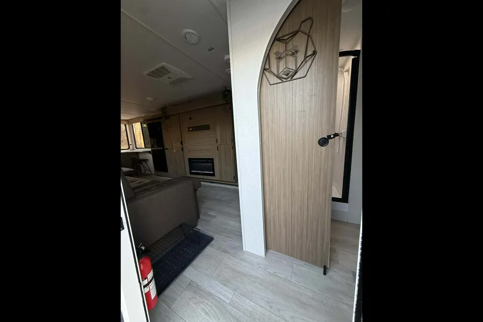 Une note de l’hôte: Curious as to what to expect? Check the following for more information on what the delivery looks like : 1. Delivery Timing Preferred delivery: Approximately 2 hours before your scheduled arrival to ensure the RV is fully set up and ready for you. Flexible timing: We can adjust delivery within the day to best fit your schedule. You will receive a call or message 2 hours prior to arrival as a courtesy notification. 2. Setup & Utilities RV will be positioned and leveled on your site and hooked into electricity and sewage. Both A/C units are will be running at time of arrival and set at a comfortable 72 degrees (Note: each requires 30 amps; 50-amp service recommended for both to run). Site requirements: access to 50-amp service, freshwater hookup, and sufficient space for RV length (32 ft). 3. Tanks – Grey & Black A notebook/manual inside the RV shows: How to check tanks/dump the grey and black tanks via actuator buttons for easy dumping. 4. Comfort & Entertainment 54” TV ready to stream (Wi-Fi/hotspot included) Digital keypad entry active for convenience Basic camping supplies, chairs, and games provided 5. Bed & Sleeping King Versa-Tilt bed will be fully prepared for immediate use in addition to the bunk beds in the bunkhouse. Extra linens for the couch will be located in storage underneath the couch.