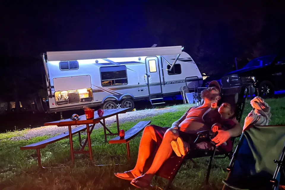 The exterior of the trailer has a large wide LED lit awning, outdoor speakers, and an outdoor kitchen featuring an induction cooktop, and small fridge.