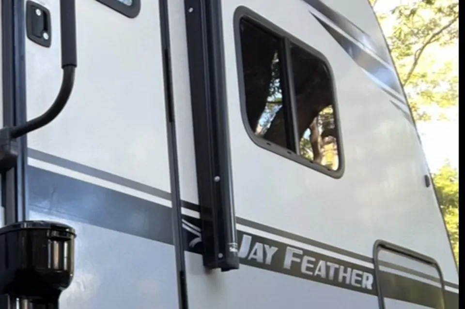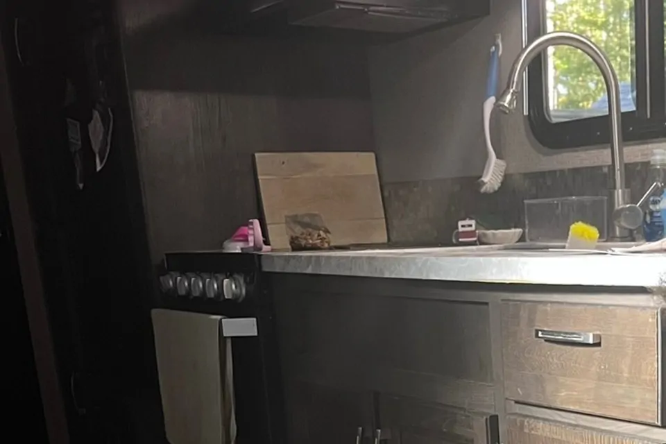 This modern, stylish bunkhouse is perfect for family trips! The front bedroom area includes a pull-down queen bed, with USB ports and outlets in both nightstands, under bed storage, and two closets.