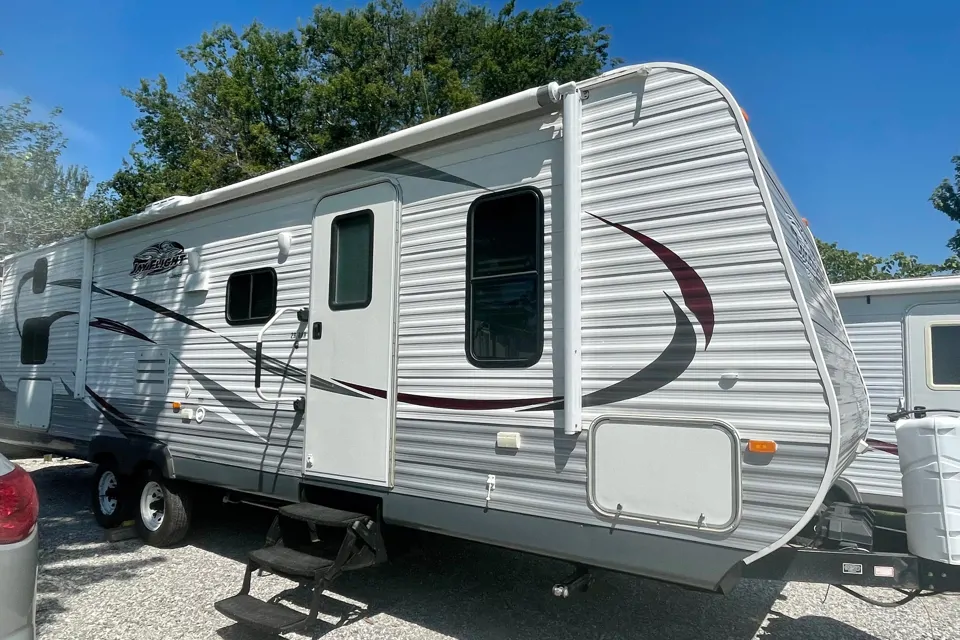Beautiful 2014 Jayco JayFlight 29ft bunkhouse travel trailer! Sleeps 10! Located 1 mile from beautiful Lake Texoma in Denison, Texas! Amenities: 2 TV’s indoor/outdoor sound system, inside/outside shower, queen size bed with privacy doors, 4 bunk beds, fully stocked kitchen, linens, bedding and towels included!