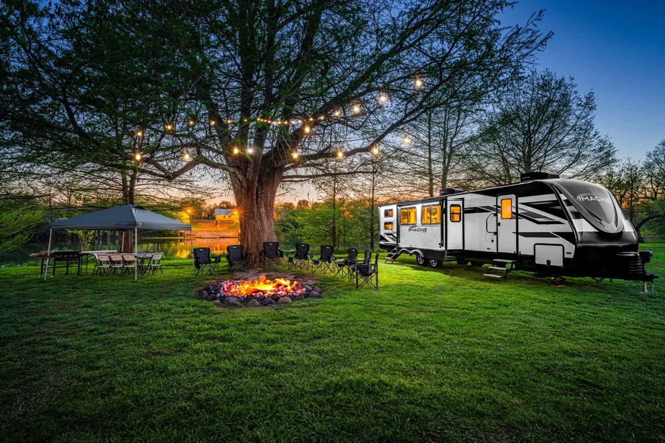 Welcome to The Tumbleweed! This 2024 Grand Design Imagine 3210BH has it all! Spacious, open living area includes four heated massage chairs and booth-style dinette… now everyone has a place to relax! A fully-stocked kitchen and coffee bar means you won’t have to sacrifice home-cooked meals during your getaway! Main bedroom has secondary private entry/exit. Oversized full bathroom with walk-in shower. Bunk room sleeps four and dinette table converts to full bed for additional sleeping. Pictures include optional linens and outdoor party pack (see item details and pricing below) Cantina string lights shown are added with photoshop and are not offered).
