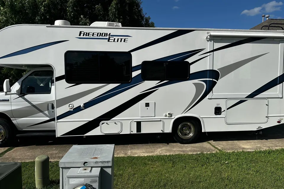 Cozy, comfy villa on wheels that has all your needs for your home away from home! This 2021 Thor Motor Coach Freedom Elite 26HE is a versatile and family-friendly Class C motorhome designed for comfort and convenience on the road. Built on a Ford E350 chassis, it features a robust 7.3L Triton V8 engine delivering 350 horsepower and 468 lb-ft of torque, paired with a 6-speed TorqShift automatic transmission. This RV is pet friendly and has had our dogs in tow, so do not be surprised to find an occasional hair for the pet weary! Also the bunk specified is actually a full size cabin above the driver/passenger cabin. It has a privacy curtain. Natural wear and tear for being used. Linens are BYOB.