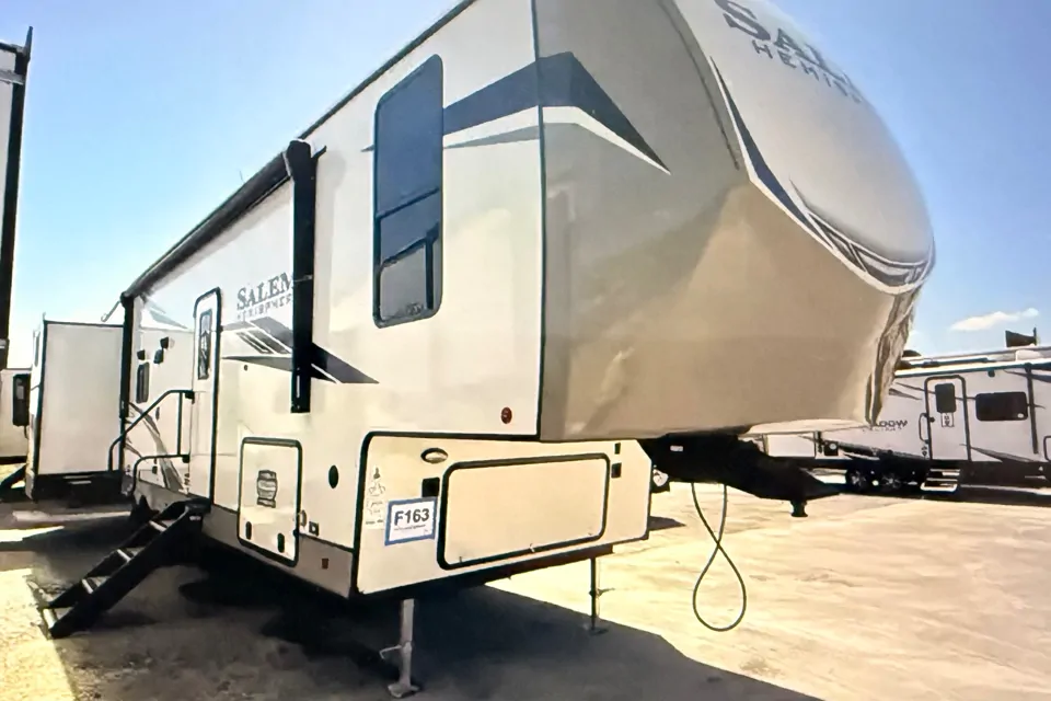 This is a beautiful, family-friendly RV. It sleeps ten people, has four slide-outs, and has many amenities, including an outdoor kitchen with a fridge and griddle.