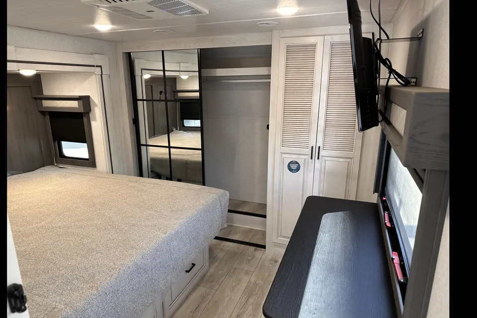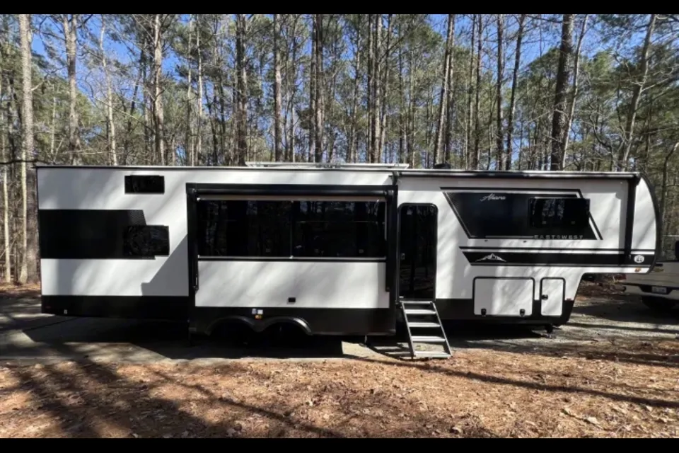 Luxury fifth-wheel RV designed for full-time living and features two distinct bedroom areas with a loft for sleeping, plus two full bathrooms. It boasts a 102" wide-body construction, a fully painted fiberglass exterior, frameless windows, and a spacious drop-frame pass-through storage area. The RV comes with premium features like a 6-point hydraulic leveling system, dual power awnings.