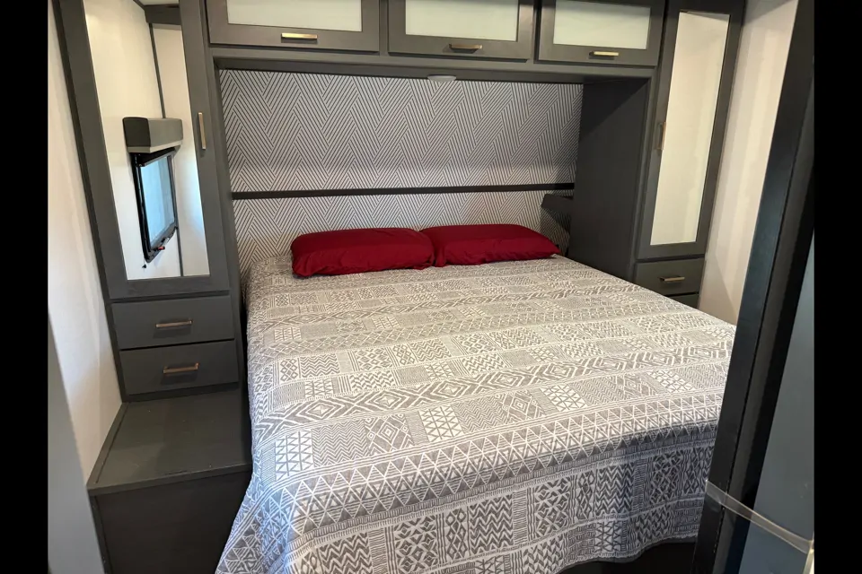 Two AC's for those hot Texas summers (requires 50 amp service to run both), comfortable recliners, privacy door to main bedroom, pull curtain for bunks, residential refrigerator and outdoor burner w/mini fridge.