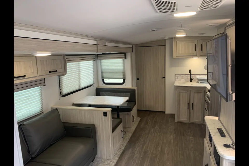 Step inside and you’ll find a bright, spacious interior designed for relaxation and convenience. With plush seating, comfortable sleeping spaces, and a fully stocked kitchenette featuring a fridge, stove, and microwave, you’ll have everything you need for a smooth trip. The climate-controlled cabin makes it easy to stay cozy on cool nights and cool on hot days.