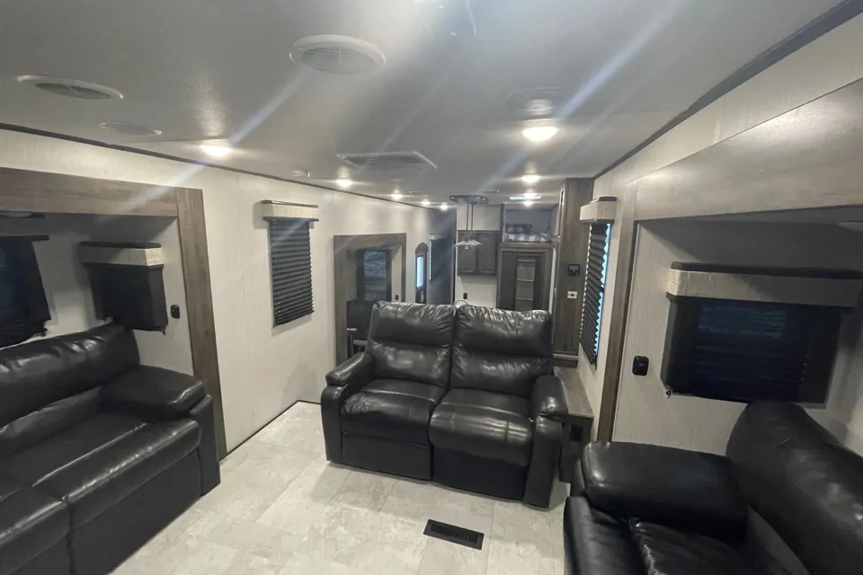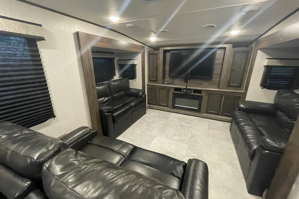 Front living room with two recliners and love seats that fold out to couches for two extra beds.