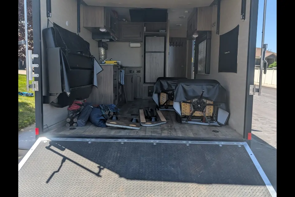 The perfect trailer for lots of camping fun. Toy hauler holds 1 four-wheeler or a couple of motorcycles, or a small side-by-side. (not suitable for large side-by-side)