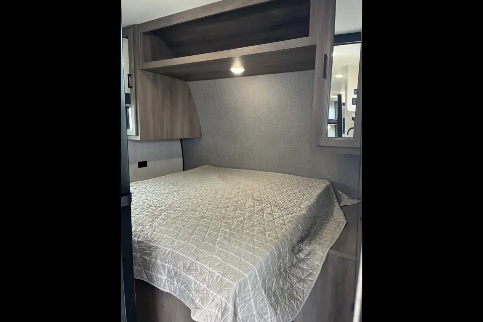 Inside, the front master bedroom features an ultra-comfortable, RV-sized queen mattress with dual wardrobes for plenty of storage. The main living area boasts a large slide-out with a sofa/sleeper and a surround sound music system. The dinette seats four and easily converts into a full-size bed, as does the sofa. A pantry behind the refrigerator offers ample storage—a true game-changer!