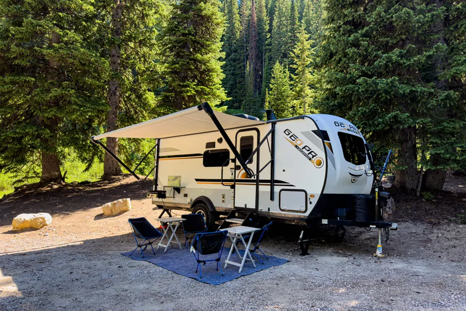 This beautiful 2021 Rockwood Geopro 20BHS, comes with the highest quality camping equipment! This trailer can easily sleep 6, with a full master bed, 2 bunks, and a table-bed conversion. We try to make your camping experience as simple as possible, by providing the camping gear you would need for your trip! We provide clean, fresh, Book a last-minute trip for this weekend right away! Price discounted for this weekend only!comfortable lines and a soft comforter on the master bed, and 4 comfortable sleeping bags for the rest of the beds. The trailer itself is equipped with the highest quality equipment. This includes a dual propane, dual battery system, solar, 3000W air conditioning, a furnace, automatic awning, and more! This very spacious trailer is great for families of all sizes!