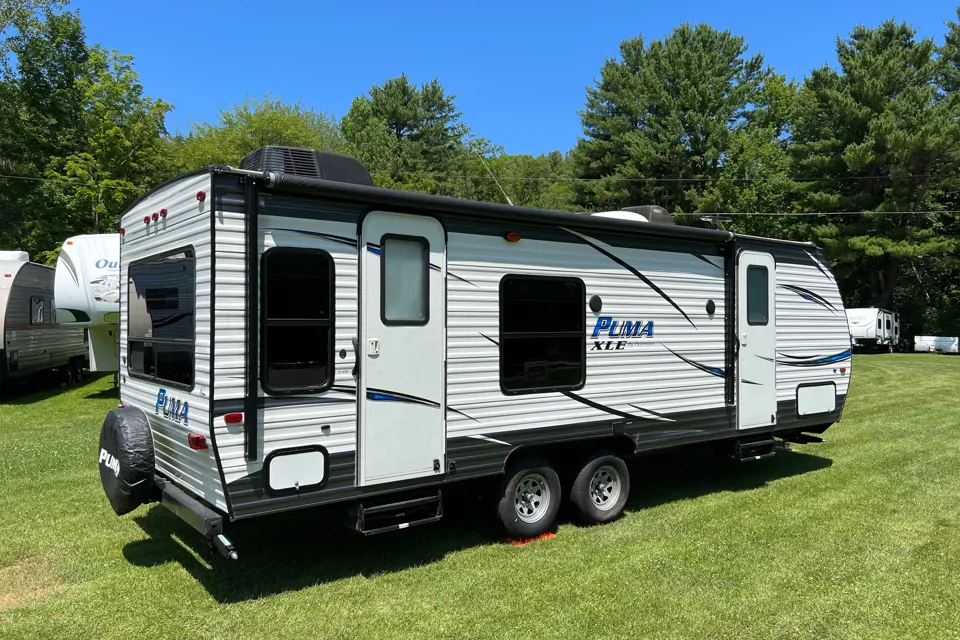 The exterior of the trailer has a power retractable awning, two large, underfloor storage units with locks, an outdoor shower, and exterior power outlets. Includes two 20lbs propane tanks.