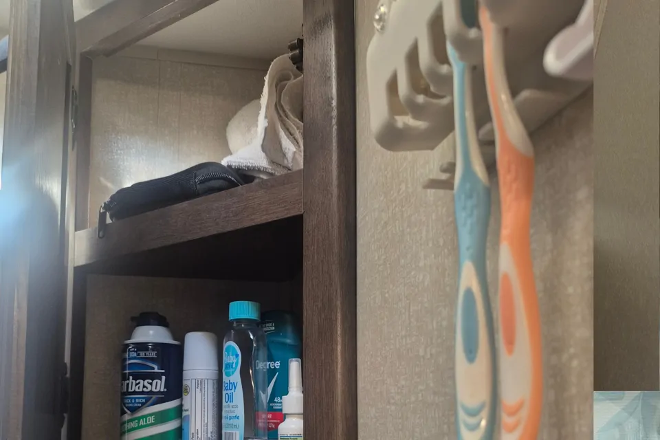 Spacious, Cozy lots of extras. Including Linens, utensils, towels and Toilet paper 🧻 Sleeps six comfortably. Full kitchen with pot and pans, Air fryer, and deluxe 8-1. Full stero and television outside for outdoor entertainment. Power awning for those nights you just like to stay outside for awhile.