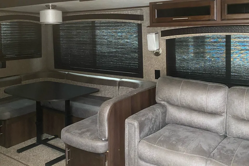 Trailer is cleaned to meet CDC recommendations. Smoke free and pet friendly. Contains 1 queen bed, a sofa sleeper, breakfast nook that turns into a sleeper, a bunk bed and loft bed. 3 TV's to keep everyone occupied even when you disconnect. Outdoor kitchen so you can enjoy your company outside or tailgate and not miss any big game!